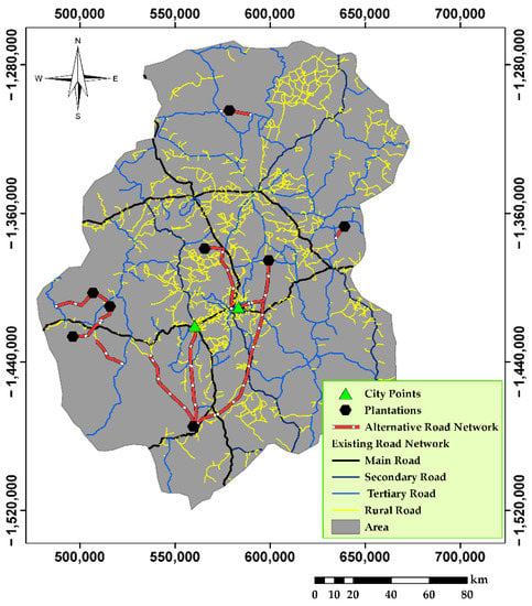 Figure 11 illustrates the entire road network, including the alternative routes based on the AHP method. In addition, the road network was divided into four main categories: main roads, secondary roads, tertiary roads, and rural roads. The alternative routes are flexible, more realistic, and feasible since they allow connectivity with the existing roads (see details in Figure 11).