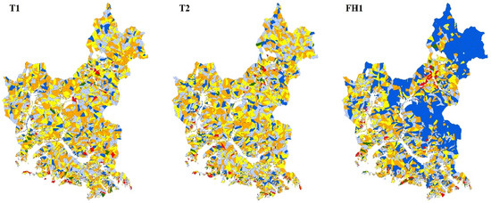 The spatial assignment of optimal management prescriptions of various alternative strategies for timber production at Maoershan Forest Farm, China: timber-oriented management strategy (TMS, scenarios T1 and T2), fixed selection of suitable habitat management strategy (FSSHMS, scenarios FH1 and FH2), and free selection of restricted suitable habitat management strategy (FSRSHMS, scenarios F1 to F4).