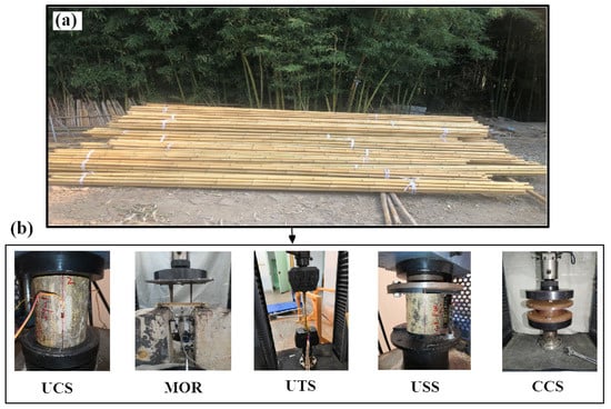 Bamboo specimens and material tests for different strengths (UCS refers to compression strength parallel to the grain, MOR refers to bending strength, UTS refers to tensile strength parallel to the grain, USS refers to shear strength parallel to the grain, CCS refers to compression strength perpendicular to the grain): (a) selection of bamboo; (b) test.