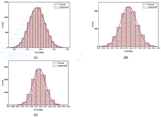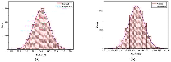 where x is a random variable, representing the measured UCS, MOR, UTS, USS, and CCS in this study, a and S are the mean value and standard deviation, respectively, b is the average value of lnx, and c is the standard deviation of lnx.