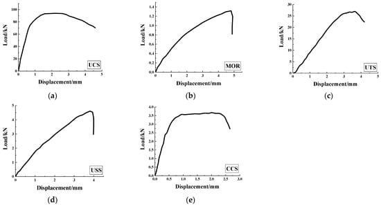 The typical load-displacement curves: (a) UCS; (b) MOR; (c) UTS; (d) USS; (e) CCS.