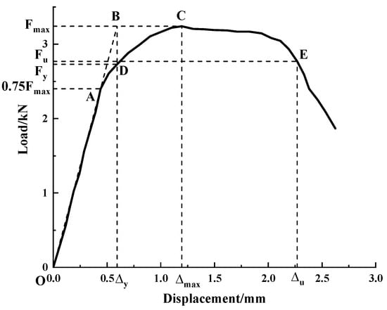 where μ is the ductility factor, ∆y is the yield displacement, and ∆u is the displacement corresponding to the ultimate load Fu (0.85 times the maximum load Fmax). The PARK method is used to locate ∆y (Figure 4). Specifically, through the two points Fmax and 0.75 Fmax on the curve, we can draw a perpendicular line to the vertical axis and intersect the curve at point A and Point C, respectively. Then, we can connect OA, intersect the horizontal line between point C and the vertical axis at point B, and make a vertical line crossing the horizontal axis through point B, and the displacement of point intersecting horizontal axis is the yield displacement ∆y.