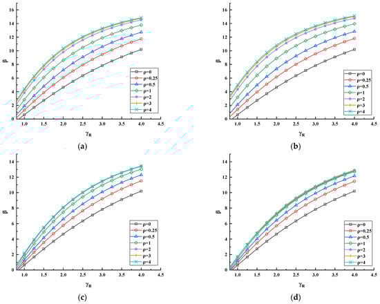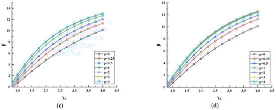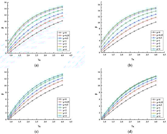 Bending strength reliability curve (β refers to reliability index, γR refers to resistance factor): (a) D + R; (b) D + O; (c) D + W; (d) D + S.
