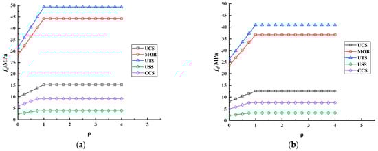 In the first group of load combinations, when ρ > 1.0, the resistance factors can ensure the safety of the structure, so adjustment is not necessary in this case. When ρ < 1.0, the design strengths shall be adjusted according to the resistance factors. The ratio of the reciprocal of the resistance factor when ρ = 0 to the reciprocal of the resistance factor when ρ = 1.0 was used as a reference value of the adjustment coefficient. The design strengths of various mechanical properties were adjusted by the formula in Table 5, where λ is the adjustment coefficient. Under the second group of load combinations, the design strengths were adjusted by the ratio of the larger resistance factors when ρ = 1.0 and the corresponding resistance factors of the first group. With this adjustment, the design strengths of UCS, MOR, UTS, USS, and CCS under the second group of load combinations need be multiplied by the reduction coefficient of 0.83 based on the first group.