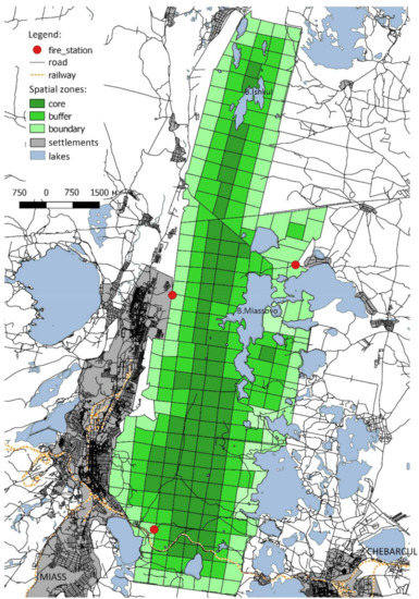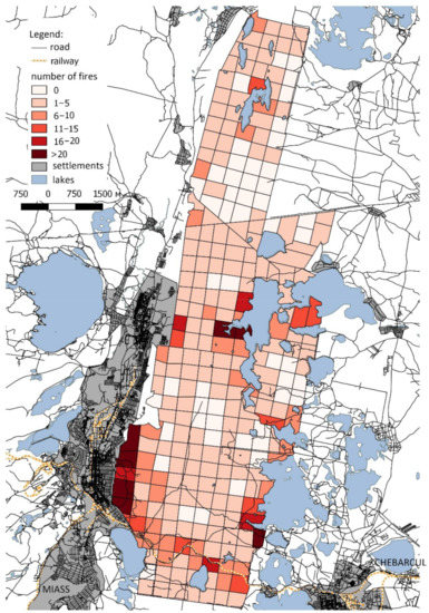 Variability of the spatial pattern of forest fires at the mesoscale (10–100 km2) is poorly studied in the Eurasian southern boreal forest. Most of the studies in this region have used Earth remote sensing data to describe the spatial variability of fires at a scale of thousands of kilometres [13,20,25]. Existing analyses of the fire numbers and areas in different periods [26,27] lack a spatial component, although a number of studies have provided detailed fire maps [28,29,30]. Recently, detailed assessments of the canopy fuel and forest fire risk for different districts have been obtained using LiDAR techniques [31,32,33].