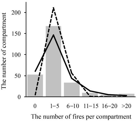 A non-random occurrence of fires was confirmed by analyzing the frequency distribution of the number of fires within forest compartments (Figure 3 and Figure 4). The empirical distribution of the number of fires in the compartments differed significantly from the Poisson distribution: χ2 = 43.80, dF = 2, p < 0.0001. However, the empirical distribution did not differ significantly from the inverse binomial distribution used to describe contagiously distributed objects: χ2 = 5.58, dF = 4, p = 0.2324. We suggest the presence of compartments and groups of closely located compartments that burned significantly more frequently than the whole reserve territory on average.