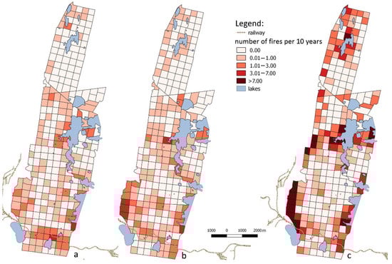 The spatial distribution of the number of fires per compartment per 10 years in (a) 1948–1970, (b) 1971–1990, and (c) 1991–2014.