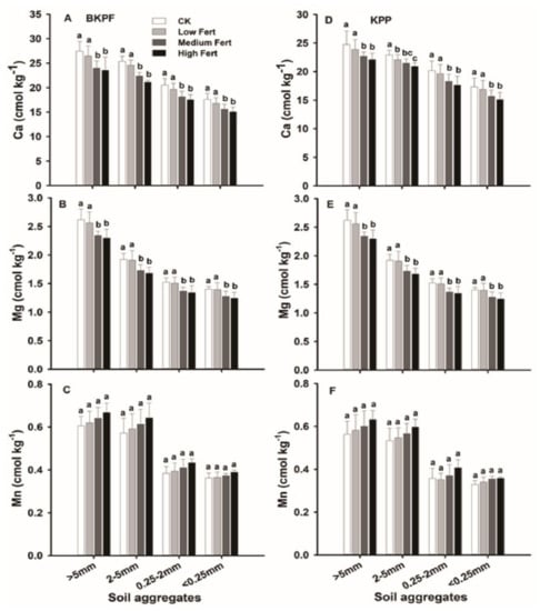 Calcium (Ca2+) (cmol kg−1) (A,D), magnesium (Mg2+) (cmol kg−1) (B,E), and manganese ion (Mn2+) (cmol kg−1) (C,F) at the control (C: no additional deposition; white bars) and after low NP: 05-g N m−2 a−1 + 05-g N m−2 a−1; light grey, medium NP: 15-g N m−2 a−1 + 10-g N m−2 a−1; dark grey, and high NP: 30-g N m−2 a−1 + 20-g N m−2 a−1; black fertilization in respective soil aggregates >5 mm, 2–5 mm, 0.25–2 mm, and <0.25 in three replications at 0–20 cm soil depth of broad-leaved Korean pine forest (BKPF) and Korean pine forest (KPP) in Northeast (NE) China. Significant differences between treatments are indicated by different lower-case letters (Tukey’s HSD post hoc; p < 0.05; mean ± SE).