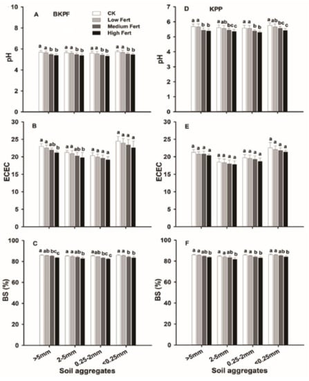 Soil pH (pH) (A,D), effective cation exchange capacity (ECEC) (B,E), and base saturation percentage (BS%) (C,F) at the control (C: no additional deposition; white bars) and after low NP: 05-g N m−2 a−1 + 05-g N m−2 a−1; light grey, medium NP: 15-g N m−2 a−1 + 10-g N m−2 a−1; dark grey, and high NP: 30-g N m−2 a−1 + 20-g N m−2 a−1; black fertilization in respective soil aggregates >5 mm, 2–5 mm, 0.25–2 mm, and <0.25 in three replications at 0–20 cm soil depth of mixed broad-leaved Korean pine forest (BKPF) and artificial Korean pine forest (KPP) in Northeast (NE) China. Significant differences between treatments are indicated by different lower-case letters (Tukey’s HSD post hoc; p < 0.05; mean ± SE).
