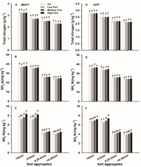 Total nitrogen (A,D), NH4-N (mg kg−1)(B,E), and NO3-N (mg kg−1) (C,F) at the control (C: no additional deposition; white bars) and after low NP: 05-g N m−2 a−1 + 05-g N m−2 a−1; light grey, medium NP: 15-g N m−2 a−1 + 10-g N m−2 a−1; dark grey, and high NP: 30-g N m−2 a−1 + 20-g N m−2 a−1; black fertilization in respective soil aggregates >5 mm, 2–5 mm, 0.25–2 mm, and <0.25 in three replications at 0–20 cm soil depth of mixed broad-leaved Korean pine forest (BKPF) and artificial Korean pine forest (KPP) in Northeast (NE) China. Significant differences between treatments are indicated by different lower-case letters (Tukey’s HSD post hoc; p < 0.05; mean ± SE).
