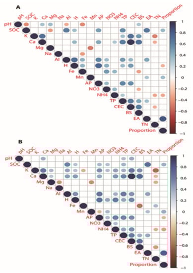 Heat map for Pearson’s correlation coefficients of soil aggregates and soil chemical properties mixed broad-leaved Korean pine forest (BKPF) (A) and artificial Korean pine forest (KPP) (B) in Northeast (NE) China. The chemical properties were identified in each sample by circle size and colors deduced from −1.0 to +1.0. Abbreviations: hydrogen ions (H+); potassium ions (K+); magnesium ions (Mg2+); manganese ions (Mn2+); sodium ions (Na+); calcium ions (Ca2+); aluminum ions (Al3+); iron ions (Fe3+); effective cation exchange capacity (ECEC); base saturation percentage (BS%); effective acidity (EA); ammonium (NH4+-N); nitrate (NO3+-N); total nitrogen (TN); soil organic carbon (SOC); soil pH.
