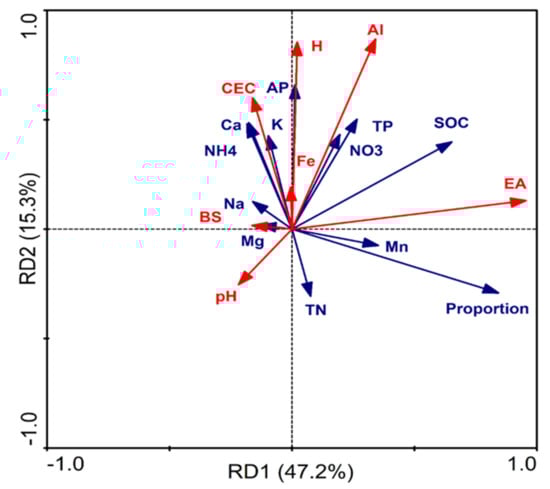 The redundancy analysis (RDA) revealed the interrelations between soil properties and soil related environmental parameters (soil pH, EA, BS%, ECEC, H+, Fe3+, and Al3+) (Figure 5). The first and second axis of RDA accounted for 47.2% and 15.3% of the total variations, respectively. Al3+, H+, and ECEC have a strong positive effect on TP, NO3, AP K+, Ca2+, and NH4–N, with a strong negative effect on the proportion % and TN (Figure 5). Similarly, E.A has a strong positive impact on SOC, Mn2+, and proportion %, with a weak correlation with AP, TP, NO3–N, Ca2+, and K+. However, Fe3+, BS, and pH weakly correlated to either parameter (Figure 5).