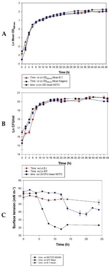 Surface tension of the culture fluids of the A. migulanus Nagano strain declined severely after 5 h of subculturing (Figure 1C). The stabilizing surface tension value was approximately 36 mNm−1 after 12–24 h of growth. The culture fluids of the NCTC 7096 strain showed a surface tension that began to decline after 12 h of subculturing with a final reduction to approximately 44 mNm−1, whereas the surface tension of the culture fluids of the A. migulanus Nagano E1 mutant did not show any decline over all the culture period, with a constant value of 54 mNm−1.