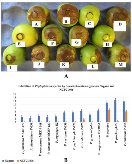 (A) In vivo pathogenicity assay of Phytophthora species on apple fruits; (A) P. cryptogea E2, (B) P. rosacearum MKDF-148, (C) P. quercina, (D) P. plurivora MKDF-179, (E) P. cinnamomi SCRP 127, (F) P. cambivora P-075, (G) P. taxon Pgchlamydo P-126, (H) P. psychrophila, (I) P. megasperma MKDF-7, (J) P. citrophthora P-139, (K) P. cactorum P-138, (L) P. gonapodyides, (M) P. ramorum P-018 (7 days after inoculation at 20 °C). (B) Inhibition of Phytophthora species by A. migulanus in screening assay. Vertical bars represent standard errors of the means (N = 5).