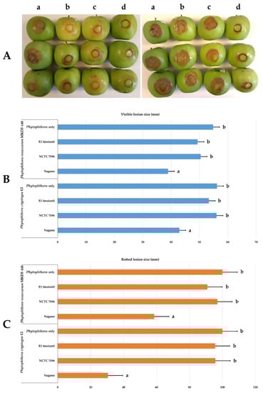 The ability of A. migulanus strains (Nagano, NCTC7096, and E1) to inhibit the development of disease was tested using a modified pathogen-baiting technique based on apples []. Granny Smith apples were washed with 70% ethanol followed by distilled water. The core of the tissue was then removed approximately 16 mm in depth aseptically with a sterilized 18-mm cork borer. The wound was inoculated with 500 µL of washed bacterial cell suspension (Nagano, NCTC, and E1), and the excised core was replaced. Apples were incubated at room temperature overnight before the inoculation with 6-mm-diameter mycelial discs of the Phytophthora species previously grown on 5% V8 medium []. For each test of the Phytophthora species, 10 replicate apples were inoculated with the pathogens. Negative controls were treated with 500 µL of distilled water. Treated apples were incubated in the dark at 25 °C, and the amount of rot that occurred was assessed by measuring the diameter of the externally visible lesions using graduated digital calipers at 48-h intervals. After 6 days, whole apples were weighed before excising and weighing the rotten tissues to calculate the proportion of rot.