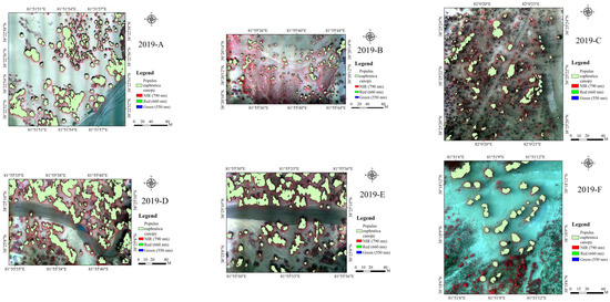 Figure 6 is a schematic diagram of the Populus euphratica crown extraction steps in 2019-A quadrat. The extraction process of Populus euphratica crown in other quadrats is the same, so it is not displayed again. Figure 6a and Figure 6b are the false color synthetic multispectral UAV image and NDVI image of 2019-A quadrat, respectively. Figure 6c–f show the extraction process of Populus euphratica crown, and the specific steps mainly include: (1) setting the threshold number of segmentation to 2 and inputting the NDVI map into the GWO-OTSU algorithm for operation. (2) The output result of the GWO-OTSU algorithm was binarized. (3) The enhanced Forst filter was used to perform 7 × 7 filtering for binarization result, and small noise points were filtered. (4) The zero value of filter graph was nulled to facilitate vectorization operation. (5) The vectorization of the null-valued raster image was performed to obtain a vector map of Populus euphratica crowns.