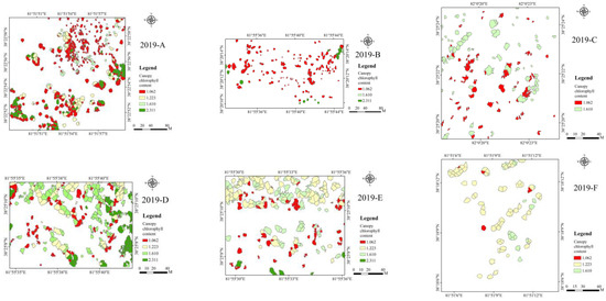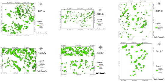 Next, the vector map of Populus euphratica crown should be optimized. First, the vector areas were counted, and vectors with an area less than 3 m2 were removed (based on the results of field research on Populus euphratica in the study area, the range of PeITC area was set to 3–80 m2). Second, the extraction result was checked by visual determination and the non-Populus euphratica vectors were removed to ensure the extraction accuracy. Third, all Populus euphratica quadrat images were processed in turn. The optimal threshold results for each quadrat are shown in Table 4, and the vector extraction results of Populus euphratica canopy in each quadrat are shown in Figure 7.