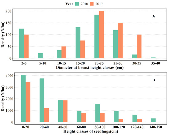 Distribution of diameter at breast height classes for adult trees (A) and distribution of height classes for seedlings (B) of Quercus acutissima in 2010 and 2017, respectively.