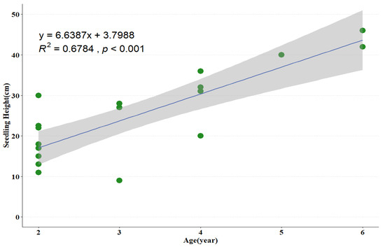 Linear regression between seedling height and age of Quercus acutissima seedlings.