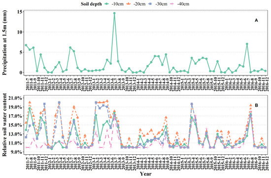 Variation of precipitation and relative soil water content in the Quercus acutissima plantation from 2011 to 2016. (A) Precipitation at 1.5 m; (B) relative soil water content.