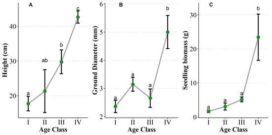 Seedling age had a significant effect on height (F = 11.01, p < 0.01), ground diameter (F = 11.38, p < 0.01), and biomass (F = 18.60, p < 0.01). The height increased significantly with age (Figure 4A). Ground diameter and biomass showed no significant difference among age groups I, II, and III, and increased significantly at IV (Figure 4B,C).