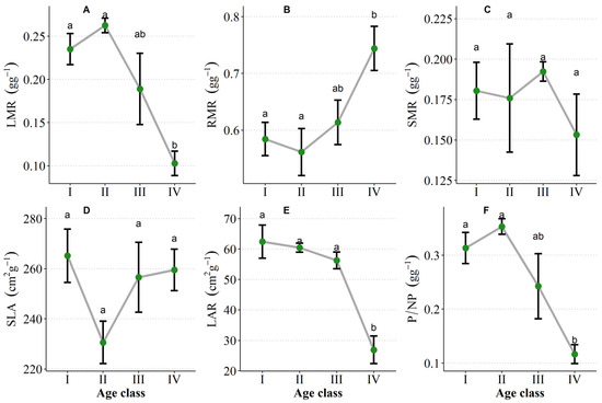 Variance analysis showed that seedling age had significant effects on LMR (F = 5.51, p < 0.01), RMR (F = 3.34, p < 0.05), LAR (F = 5.93, p < 0.01), and p/NP F = 5.15, p < 0.05), but not on SMR (F = 0.41, p = 0.75) nor SLA (F = 1.20, p = 0.35). There were no significant differences among age groups I, II, and III in LMR, LAR, and p/NP, but these indices all decreased significantly at IV (Figure 5A,E,F). As the age increased, the RMR decreased first and then increased significantly (Figure 5B).