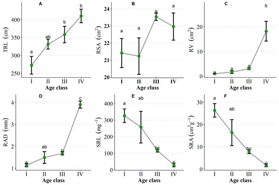 Changes of root traits with the increase of seedling age of Quercus acutissima. (A) TRL, total root length; (B) RSA, root total surface area; (C) RV, root volume; (D) RAD, root average diameter; (E) SRL, specific root length; (F) SRA, specific root area. Different letters above error bars show significant differences.