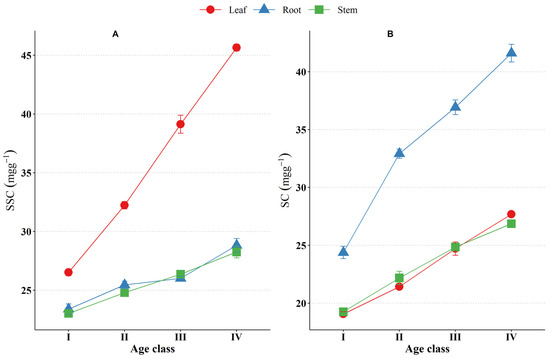 There were significant differences in SSC (F = 312.60, p < 0.01) and SC (F = 329.40, p < 0.01) among different ages. With the increase of age, the SSC and SC of the root, stem, and leaf all increased significantly, and their orders were I < II < III < IV (p < 0.01, Figure 7). Organs also showed significant effects on SSC (F = 631.57, p < 0.01) and SC (F = 543.37, p < 0.01), respectively. There was no significant difference in soluble sugar between roots and stems (p > 0.05), which was significantly lower than that of leaves (p < 0.01). For starch, the root was significantly greater than that of the stem and leaf (p < 0.01), but there was no significant difference between the stem and leaf (p > 0.05).