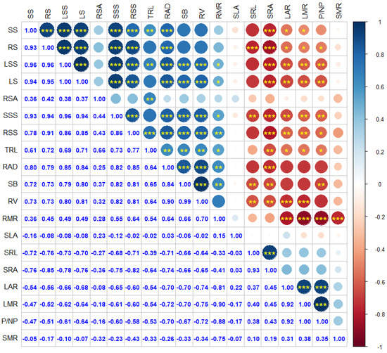 SB was negatively correlated with LMR, LAR, P/NP, SRL, and SRA, and positively correlated with RMR, TRL, RV, RAD, RSS, SSS, LSS, RS, SS, and LS (Figure 8). LMR, LAR, and P/NP were negatively correlated with RMR, TRL, RV, and RAD. RSS, SSS, LSS, RS, SS, and LS were negatively correlated with LMR, LAR, P/NP, SRL, and SRA, and positively correlated with RMR, TRL, RV, and RAD (the correlation between SS and RMR was not significant).
