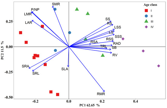 The PCA incorporating seedling traits revealed that together, the first and second principal components represented 74.15% of the total variation (Figure 9). The first principal component (62.65%) was mainly related to seedling growth, including SB, NSC (SS, SSS, LSS, RS, SS, and LS), and root traits (RV, TRL, RAD, RSA, SRL, and SRA). The second principal component (11.5%) was associated with biomass allocation, including SMR, LMR, LAR, P/NP, SLA, and RMR.