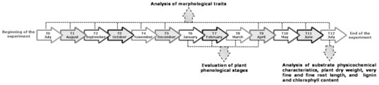 Then, 40 homogeneously rooted cuttings, with similar morphological traits (e.g., size), were selected for the experiment and transplanted, separately, into 20 L plastic pots. These pots were filled with four different growing medium combinations (hereafter also called growing substrates or treatments), and ten replicates were set up for each of them. P. euramericana plants were grown for each treatment in a greenhouse for 12 months. The experimentation began in July and ended in July of the following year. In the 12 months of experimentation, hereinafter, are indicated by the acronyms ranging from T0 to T12 (Figure 1). Growth occurred under a controlled water regime and natural photoperiod and temperature (for minimum, maximum, and average temperature values see Table S1 in Supplementary Material), and the plants were arranged in a randomized complete block design and rotated to a different position within the block throughout the trial. The pots were fully irrigated to prevent water stress (twice a day, as required), and a suspended net was used to reduce exposure to sunlight.
