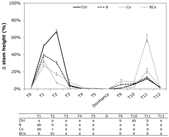 Variation (Δ) in stem height (%) determined monthly during the 12 months of P. euramericana growth on four different substrates (Ctrl, B, Co, and BCo). Different letters indicate significant differences among the treatments for each sampling time (p < 0.05) (n = 10 ± SE). Ctrl: control mix of soil and sand; B: mix of soil and sand + biochar; Co: mix of soil and sand + compost; BCo: mix of soil and sand + biochar + compost. T0 to T12: Sampling times (months).