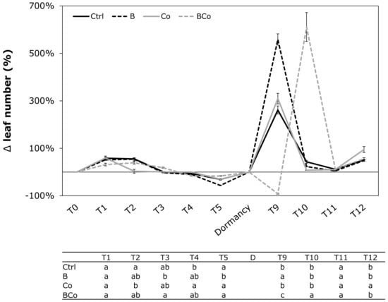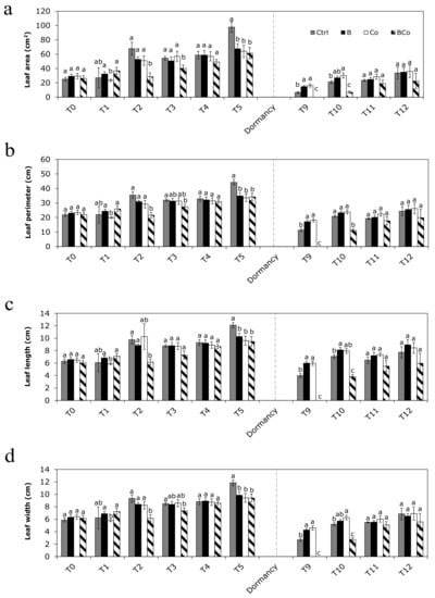 The leaf width (Figure 4d), at time T5, was slightly lower in the B (10 cm), Co (9 cm), and BCo (9 cm) plants than in the Ctrl (12 cm), whereas at time T9, it was approximately twice as large in the B (4 cm) and Co (5 cm) plants compared to the Ctrl plants (Figure 4d). This parameter resulted in the lowest BCo at time T9 and T10 (Figure 4d).