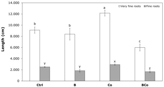 The addition of compost to the soil (Co treatment) resulted in the highest increase in the length of both very fine and fine roots (Figure 6). More specifically, the Co treatment led to a 33% and 16% increase in very fine root length (12,160 cm) and fine root length (2932 cm) compared to the control growing medium (9115 cm and 2517 cm, respectively; Figure 6). On the other hand, there was a 34% decrease in the BCo plants with respect to the Ctrl substrate (9115 cm) in the case of a very fine root length (Figure 6). Moreover, the two biochar treatments (B and BCo substrates) resulted in a decrease in fine root length of 27% (1837 cm) and 34% (1660 cm) with respect to the Ctrl (2517 cm), respectively (Figure 6).