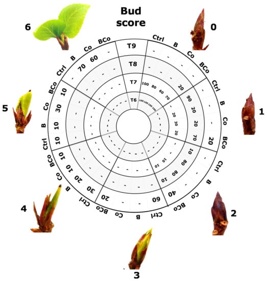 Evaluation of phenological stages of P. euramericana grown on four different substrates (Ctrl, B, Co, and BCo) by bud development analysis at different time points: winter dormancy condition (T6, January and T7, February), release from dormancy (T8, March), and active vegetative phase (T9, April). For each time point, the percentage of plants characterized by a specific stage of bud development is reported. Bud development was quantified using six levels of morphology score (0–6); minimal score (0) was given to the winter bud, and maximum score (6) to buds with a growing stem. Ctrl: control mix of soil and sand; B: mix of soil and sand + biochar; Co: mix of soil and sand + compost; BCo: mix of soil and sand + biochar + compost.