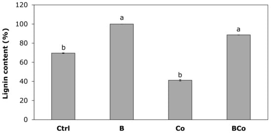 The two treatments with the biochar, both added alone (B substrate) and in combination with the compost (BCo substrate), showed the highest lignin content values in the P. euramericana roots (Figure 8). In the B treatment, the lignin content was 100%, while in the BCo mix, it was 87%. Thus, in the two biochar treatments, the lignin content was higher than the value found for plants grown in the Ctrl growing medium (70%) and 2 times higher with respect to the content measured for plants developed in the Co substrate (41%).