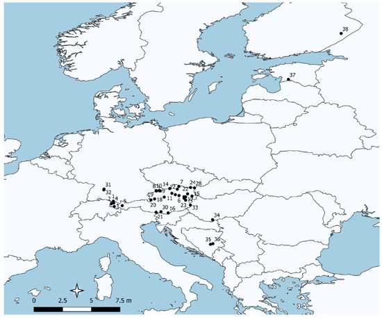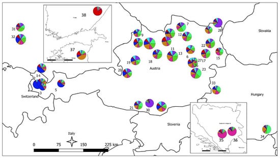 Sampling locations of populations used are shown in Figure 1. A total of 1048 individuals were successfully genotyped (samples that had missing data for more than 3 microsatellite loci were omitted). Further details on populations are given in Table 1. The results of the standard genetic diversity indices are shown in Table 3 and deviations from the Hardy-Weinberg equilibrium are depicted as a significant excess or lack of homozygotes (associated to the F-value). Significant deviation from HWE was detected in several populations, all associated with an excess of homozygotes with the exception of population 28, which showed a highly significant excess of heterozygotes. Genetic diversity (He) was 0.72 on average with lower levels in the populations from the western part of Austria; the lowest levels within Austria were the seed stand in population 28 and population 30 (Table 1)—both populations that were heavily affected by human intervention, i.e., they were planted or isolated, respectively. Likewise, these populations also showed below average values for allelic richness. In addition, the northern European populations showed relatively low levels of genetic diversity. A high level of genetic diversity was found in the majority of the Austrian populations, but also, populations from Bosnia and Herzegovina harbored similar levels of variation. A planted stand (pop. 25) and the samples of FRM retrieved from Germany (pops. 31 and 32) and Hungary (pops. 33 and 34) did not show any indication of lower diversity. However, the FRM lot population 29 (putatively derived from population 28) showed the lowest levels of diversity in the whole sample.