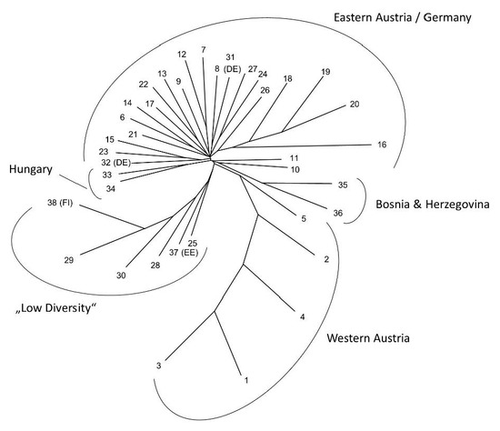The overall population structure was relatively low (overall FST = 0.06, within Austria FST = 0.04). Relationships between populations based on Nei’s standard genetic distances are shown in the unrooted UPGMA tree in Figure 2. Most Austrian samples, together with samples from Germany and Hungary, formed an unresolved large branch, while the Austrian sample populations from the west of the country clustered together in a separate branch and populations showing low genetic diversity were clustering on a third main branch (population 28, the associated lot of FRM [pop. 29], the planted stand [pop. 25], population 30, as well as the two northern European populations). Most sampled populations seemed to have experienced a recent reduction in population numbers indicated by the results of the BOTTLENECK analysis (Table 3).