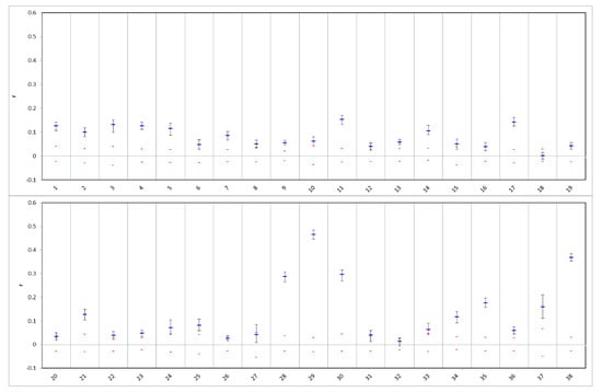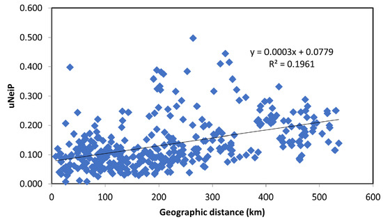 Isolation by distance was investigated for all natural populations from Austria with the Mantel test [65] and spatial genetic structure analysis (999 permutations each) using GENALEX. Spatial genetic structure was analyzed by plotting correlation graphs of geographic (x axis in kilometers) and genetic distances (y axis log Nei genetic distance). This analysis generates an autocorrelation coefficient r which lies between −1, 1 and is displayed as a correlogram; with the coefficient r related to Moran’s I [55,66,67]. The maximum geographic distance among the samples was divided into ten distance classes of equal size in kilometers. Significant geographic genetic substructures within a distance class were detected when the r value exceeded the upper/lower boundaries of the 95% confidence interval in the correlogram.