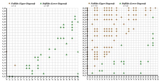 COLONY results showing the observed sibship assignment plots for individuals of population 6 on the left and individuals of population 28 on the right side.
