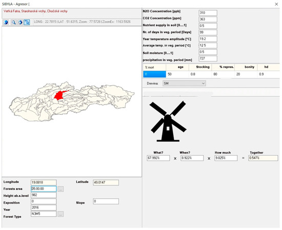 Additional software modules called “Agressor” and “Prophet” were used to predict the threat and development of the volume of incidental fellings by the SIBYLA TRIQUETRA growth simulator. A database was used to quantify the risks from the territory of Slovakia for the groups of trees spruce, fir, pine, beech, and oak. Among the harmful factors, it contains a module for quantifying risks for wind, insects, snow, freeze, fungi, drought, fire, wood theft, and unidentified causes. The sector of the analytical module for risk quantification “Agressor” is shown in Figure 1, and the sector of the forest growth and damage prediction module “Prophet” with ongoing simulation is shown in Figure 2. Models created from Slovak and German stand databases were used for modeling. For each country, the appropriate tree composition and forest structure were selected, which was up to date until 2020. This age and tree species structure was fundamentally influenced by the results of the predicted volumes of incidental fellings for the next decade.