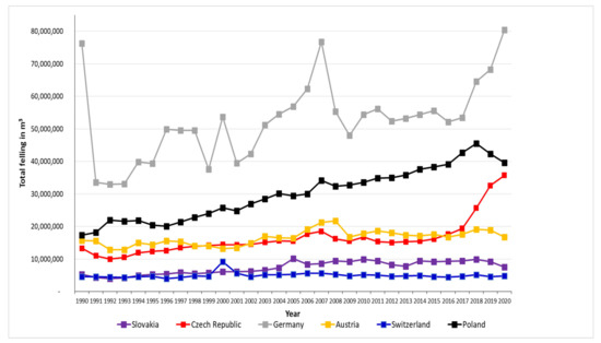 Figure 3 shows the development of timber harvesting in selected central European countries. The volume of harvesting naturally reflects the size of the country, its forest cover, as well as the tree species composition. However, it also reflects the extensive disturbances that have hit European forests in previous decades (e.g., Germany in 1990, the Lothar and Martin windstorms, or the large-scale bark beetles attack in the Czech Republic in the last 3 years). In smaller countries such as Slovakia, Austria, and Switzerland, a decline in total timber harvesting has been evident over the last three years, mainly due to a higher share of incidental fellings in the previous two decades.