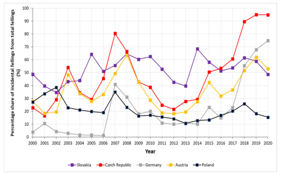 Percentage share of incidental fellings from the volume of total timber harvestings in selected European countries in the time range 2000–2020.