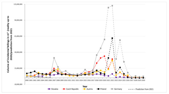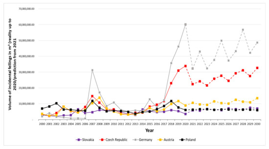 Figure 5 shows the development of incidental fellings in the countries of Slovakia, the Czech Republic, Germany, Austria, and Poland in the period 2000–2020. Continuous and accurate information on the volumes of incidental fellings in these countries was available for this period. Figure 5 also shows a prediction of the further development of incidental fellings in these countries, which is quantified by the Holt–Winters method. The prediction was calculated for 10 years ahead (period 2021–2030). In the individual time series of selected countries, the prediction in this period is shown by a dashed line.