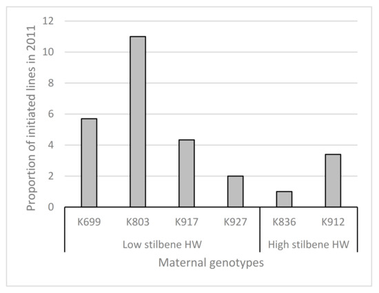 The initiation success of the seed embryo explants originating in the controlled crossings varied depending on the cross (Figure 3), resulting in altogether 126 embryogenic lines in 2012–2013 (Table 4). Maternal parents K803 (low) and K912 (high) crossed with paternal parent K836 (high) were the best combinations, which produced more than half of the initiated lines. K927 (low) was the poorest maternal parent, giving only one initiated line. Seed embryo explants from controlled crossings were not studied for stilbene content.