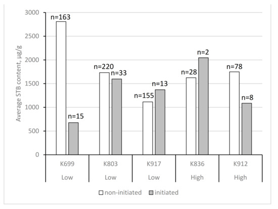 Average stilbene content (STB) in the initiated and non-initiated seed embryo explants of the 2011 cone collection (open-pollinated). The samples for STB analysis were pooled into two or three batches within each maternal genotype. Numbers on the top of each column represent the total number of the explants within the pooled batches. Because of the sampling scheme, the error bars cannot be given. Low/high stilbene content in the heartwood of the maternal genotype in 2011 HPLC analysis (Low/High).