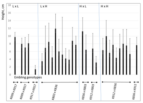 Height of the emblings at the greenhouse following the first growing season, shown with the standard deviation. The genetic background, i.e., the controlled crossing, is shown under each group of SE lines, the crossings being organized according to the heartwood stilbene content of the parent genotypes. Low stilbene content (L) and high stilbene content (H) in the heartwood of the parent genotype.