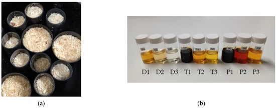 (a) Pine sawdust raw material samples in metal holders before pyrolysis process. (b) Representative distillate fractions from drying (D1, D2, D3), torrefaction (T1, T2, T3) and pyrolysis (P1, P2, P3) phases after pyrolysis process.