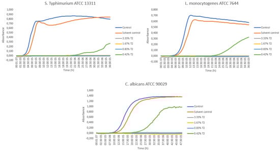 Growth curves of Salmonella, Listeria and Candida strains for the sample T2 in solution concentrations of 3.33% (v/v) (grey line), 1.67% (v/v) (yellow line), 0.83% (v/v) (light blue line) and 0.42% (v/v) (green line) in Bioscreen C assays. (Control (blue line) = microbe control, Solvent control (red line) = 2.9% DMSO).