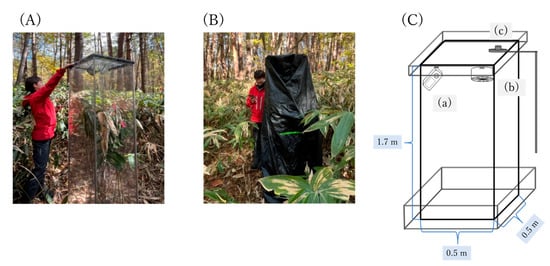 Measurement of the Sasa community GPP under (A) 100% light and (B) 0% light. (C) Schematic illustration of the static chamber system: (a) sensor for CO2 concentration, temperature, and relative humidity with data logger, (b) mini-fan, and (c) quantum sensor.